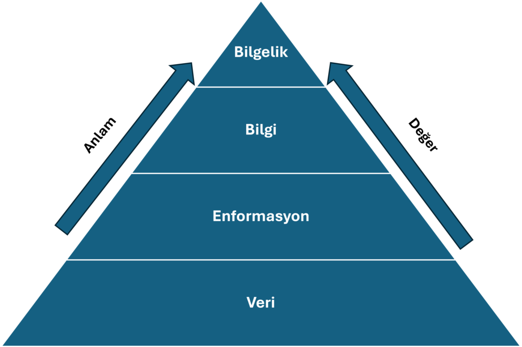 Bilgi kavramının anlaşılmasında en yaygın kullanılan modellerden biri DIKW (Data–Information–Knowledge–Wisdom) hiyerarşisidir. Bu model, bilginin oluşum sürecini katmanlı bir yapı içerisinde açıklamaktadır (Erdoğan Aydın ve Uçar, 2025; Sarıçoban ve Demir, 2024).